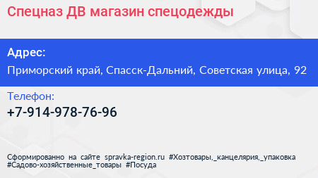 Спецназ ДВ, магазин спецодежды по адресу Приморский край, Спасск-Дальний, Советская улица, 92 в дальнейшем Организация, размещена в следующих категориях: