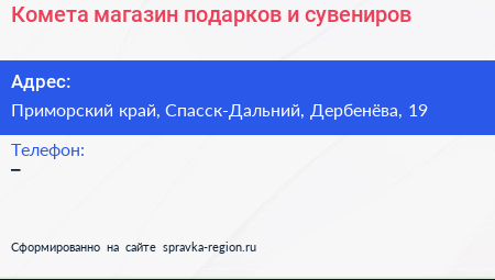 Комета, магазин подарков и сувениров по адресу Приморский край, Спасск-Дальний, Дербенёва, 19 в дальнейшем Организация, размещена в следующих категориях: