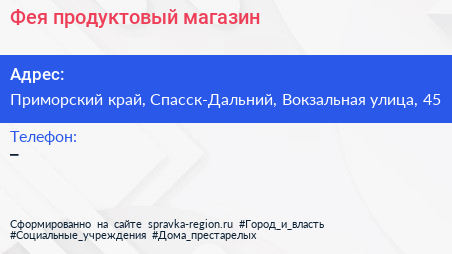 Фея, продуктовый магазин по адресу Приморский край, Спасск-Дальний, Вокзальная улица, 45 в дальнейшем Организация, размещена в следующих категориях: