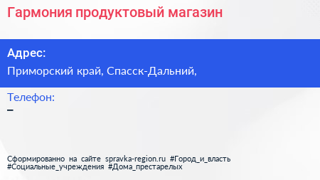 Гармония, продуктовый магазин по адресу Приморский край, Спасск-Дальний, в дальнейшем Организация, размещена в следующих категориях: