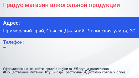 Градус, магазин алкогольной продукции по адресу Приморский край, Спасск-Дальний, Ленинская улица, 30 в дальнейшем Организация, размещена в следующих категориях: