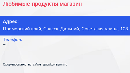 Любимые продукты, магазин по адресу Приморский край, Спасск-Дальний, Советская улица, 108 в дальнейшем Организация, размещена в следующих категориях: