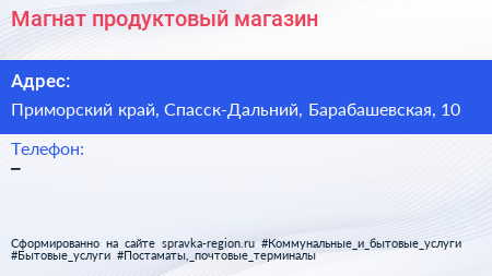 Магнат, продуктовый магазин по адресу Приморский край, Спасск-Дальний, Барабашевская, 10 в дальнейшем Организация, размещена в следующих категориях: