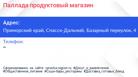 Паллада, продуктовый магазин по адресу Приморский край, Спасск-Дальний, Базарный переулок, 4 в дальнейшем Организация, размещена в следующих категориях: