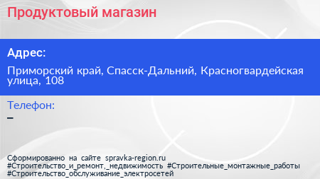 Продуктовый магазин по адресу Приморский край, Спасск-Дальний, Красногвардейская улица, 108 в дальнейшем Организация, размещена в следующих категориях: