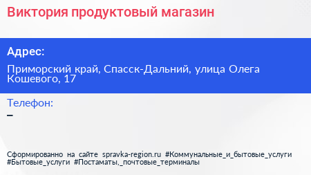 Виктория, продуктовый магазин по адресу Приморский край, Спасск-Дальний, улица Олега Кошевого, 17 в дальнейшем Организация, размещена в следующих категориях: