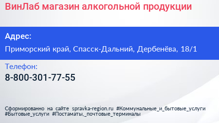 ВинЛаб, магазин алкогольной продукции по адресу Приморский край, Спасск-Дальний, Дербенёва, 18/1 в дальнейшем Организация, размещена в следующих категориях: