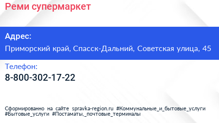 Реми, супермаркет по адресу Приморский край, Спасск-Дальний, Советская улица, 45 в дальнейшем Организация, размещена в следующих категориях: