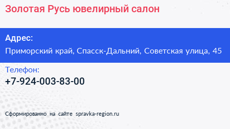 Золотая Русь, ювелирный салон по адресу Приморский край, Спасск-Дальний, Советская улица, 45 в дальнейшем Организация, размещена в следующих категориях: