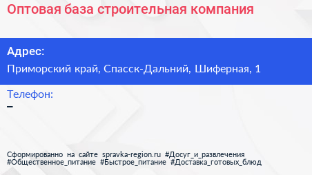 Оптовая база, строительная компания по адресу Приморский край, Спасск-Дальний, Шиферная, 1 в дальнейшем Организация, размещена в следующих категориях:
