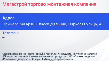 Мегастрой, торгово-монтажная компания по адресу Приморский край, Спасск-Дальний, Парковая улица, 43 в дальнейшем Организация, размещена в следующих категориях: