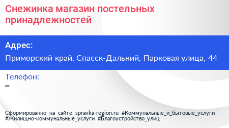 Снежинка, магазин постельных принадлежностей по адресу Приморский край, Спасск-Дальний, Парковая улица, 44 в дальнейшем Организация, размещена в следующих категориях: