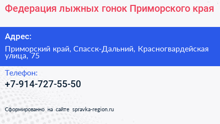 Федерация лыжных гонок Приморского края по адресу Приморский край, Спасск-Дальний, Красногвардейская улица, 75 в дальнейшем Организация, размещена в следующих категориях: