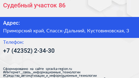Судебный участок №86 по адресу Приморский край, Спасск-Дальний, Кустовиновская, 3 в дальнейшем Организация, размещена в следующих категориях:
