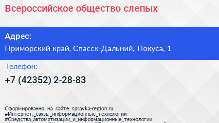 Всероссийское общество слепых по адресу Приморский край, Спасск-Дальний, Покуса, 1 в дальнейшем Организация, размещена в следующих категориях: