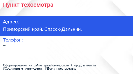 Пункт техосмотра по адресу Приморский край, Спасск-Дальний, в дальнейшем Организация, размещена в следующих категориях: