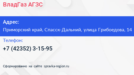 ВладГаз, АГЗС по адресу Приморский край, Спасск-Дальний, улица Грибоедова, 14 в дальнейшем Организация, размещена в следующих категориях: