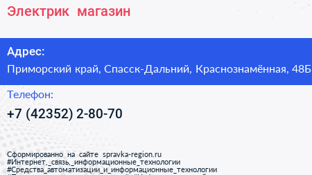 Электрик+, магазин по адресу Приморский край, Спасск-Дальний, Краснознамённая, 48Б в дальнейшем Организация, размещена в следующих категориях: