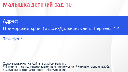 Малышка, детский сад №10 по адресу Приморский край, Спасск-Дальний, улица Герцена, 12 в дальнейшем Организация, размещена в следующих категориях: