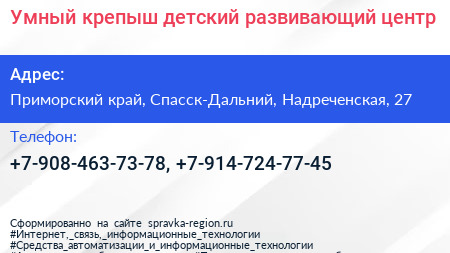 Умный крепыш, детский развивающий центр по адресу Приморский край, Спасск-Дальний, Надреченская, 27 в дальнейшем Организация, размещена в следующих категориях: