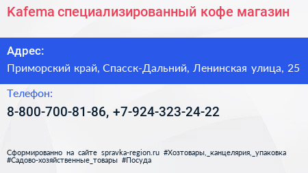Kafema, специализированный кофе-магазин по адресу Приморский край, Спасск-Дальний, Ленинская улица, 25 в дальнейшем Организация, размещена в следующих категориях: