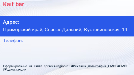 Kaif bar по адресу Приморский край, Спасск-Дальний, Кустовиновская, 14 в дальнейшем Организация, размещена в следующих категориях:
