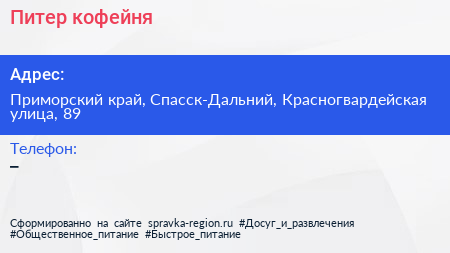 Питер, кофейня по адресу Приморский край, Спасск-Дальний, Красногвардейская улица, 89 в дальнейшем Организация, размещена в следующих категориях: