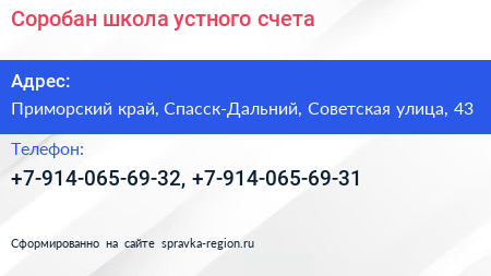Соробан, школа устного счета по адресу Приморский край, Спасск-Дальний, Советская улица, 43 в дальнейшем Организация, размещена в следующих категориях:
