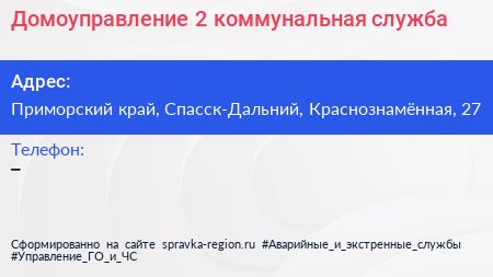 Домоуправление №2, коммунальная служба по адресу Приморский край, Спасск-Дальний, Краснознамённая, 27 в дальнейшем Организация, размещена в следующих категориях: