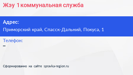 Жэу-1, коммунальная служба по адресу Приморский край, Спасск-Дальний, Покуса, 1 в дальнейшем Организация, размещена в следующих категориях: