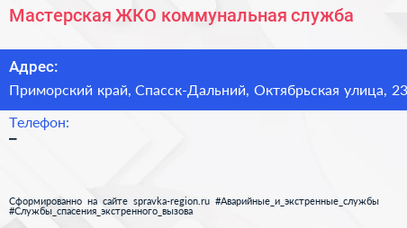 Мастерская ЖКО, коммунальная служба по адресу Приморский край, Спасск-Дальний, Октябрьская улица, 23 в дальнейшем Организация, размещена в следующих категориях: