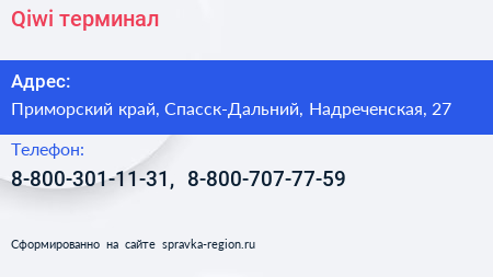 Qiwi, терминал по адресу Приморский край, Спасск-Дальний, Надреченская, 27 в дальнейшем Организация, размещена в следующих категориях: