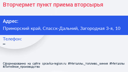 Вторчермет, пункт приема вторсырья по адресу Приморский край, Спасск-Дальний, Загородная 3-я, 10 в дальнейшем Организация, размещена в следующих категориях: