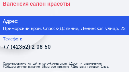 Валенсия, салон красоты по адресу Приморский край, Спасск-Дальний, Ленинская улица, 23 в дальнейшем Организация, размещена в следующих категориях: