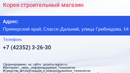 Корея, строительный магазин по адресу Приморский край, Спасск-Дальний, улица Грибоедова, 14 в дальнейшем Организация, размещена в следующих категориях: