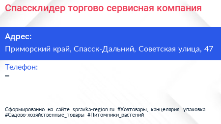 Спассклидер, торгово-сервисная компания по адресу Приморский край, Спасск-Дальний, Советская улица, 47 в дальнейшем Организация, размещена в следующих категориях: