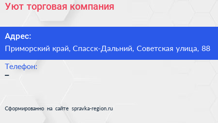 Уют, торговая компания по адресу Приморский край, Спасск-Дальний, Советская улица, 88 в дальнейшем Организация, размещена в следующих категориях: