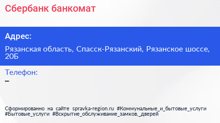Сбербанк, банкомат по адресу Рязанская область, Спасск-Рязанский, Рязанское шоссе, 20Б в дальнейшем Организация, размещена в следующих категориях: