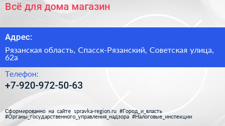 Всё для дома, магазин по адресу Рязанская область, Спасск-Рязанский, Советская улица, 62а в дальнейшем Организация, размещена в следующих категориях:
