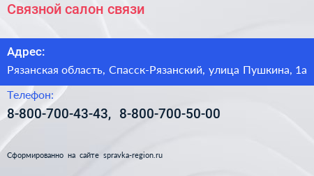 Связной, салон связи по адресу Рязанская область, Спасск-Рязанский, улица Пушкина, 1а в дальнейшем Организация, размещена в следующих категориях:
