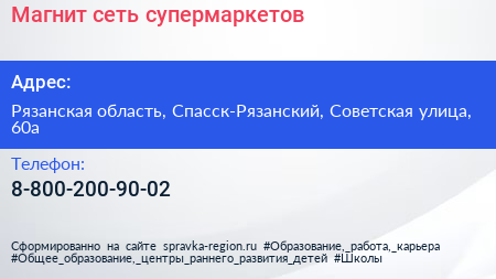 Магнит, сеть супермаркетов по адресу Рязанская область, Спасск-Рязанский, Советская улица, 60а в дальнейшем Организация, размещена в следующих категориях: