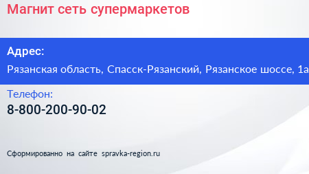 Магнит, сеть супермаркетов по адресу Рязанская область, Спасск-Рязанский, Рязанское шоссе, 1а в дальнейшем Организация, размещена в следующих категориях: