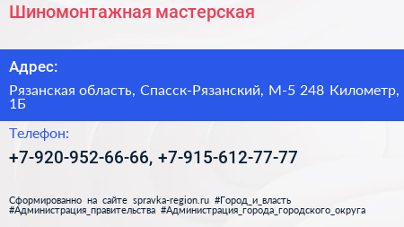 Шиномонтажная мастерская по адресу Рязанская область, Спасск-Рязанский, М-5 248 Километр, 1Б в дальнейшем Организация, размещена в следующих категориях: