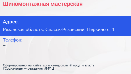 Шиномонтажная мастерская по адресу Рязанская область, Спасск-Рязанский, Перкино с, 1 в дальнейшем Организация, размещена в следующих категориях: