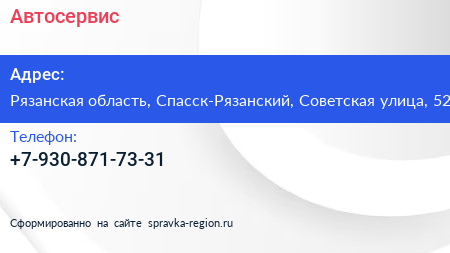Автосервис по адресу Рязанская область, Спасск-Рязанский, Советская улица, 52 в дальнейшем Организация, размещена в следующих категориях: