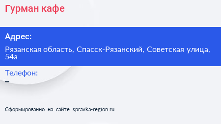 Гурман, кафе по адресу Рязанская область, Спасск-Рязанский, Советская улица, 54а в дальнейшем Организация, размещена в следующих категориях: