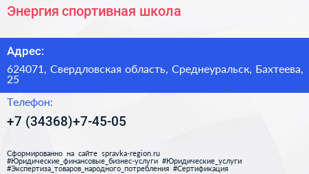 Энергия, спортивная школа по адресу 624071, Свердловская область, Среднеуральск, Бахтеева, 25 в дальнейшем Организация, размещена в следующих категориях: