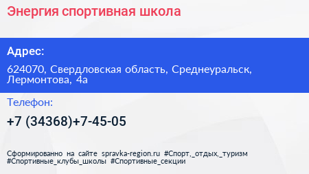 Энергия, спортивная школа по адресу 624070, Свердловская область, Среднеуральск, Лермонтова, 4а в дальнейшем Организация, размещена в следующих категориях:
