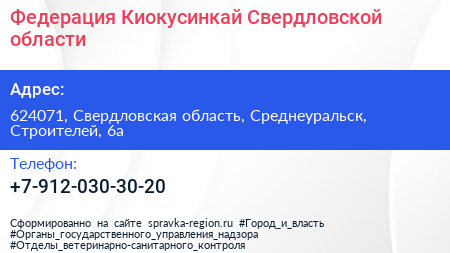 Федерация Киокусинкай Свердловской области по адресу 624071, Свердловская область, Среднеуральск, Строителей, 6а в дальнейшем Организация, размещена в следующих категориях: