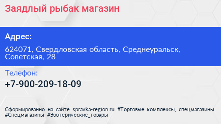 Заядлый рыбак, магазин по адресу 624071, Свердловская область, Среднеуральск, Советская, 28 в дальнейшем Организация, размещена в следующих категориях: